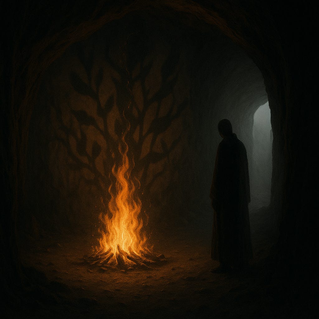 I shift again. Not just from the wall, but away from the ledge. I see it now—clearly. The fire. Not just light, but the source. The origin of shadows. The manipulations. The theatre.